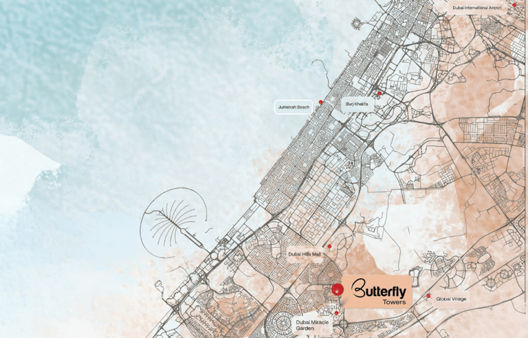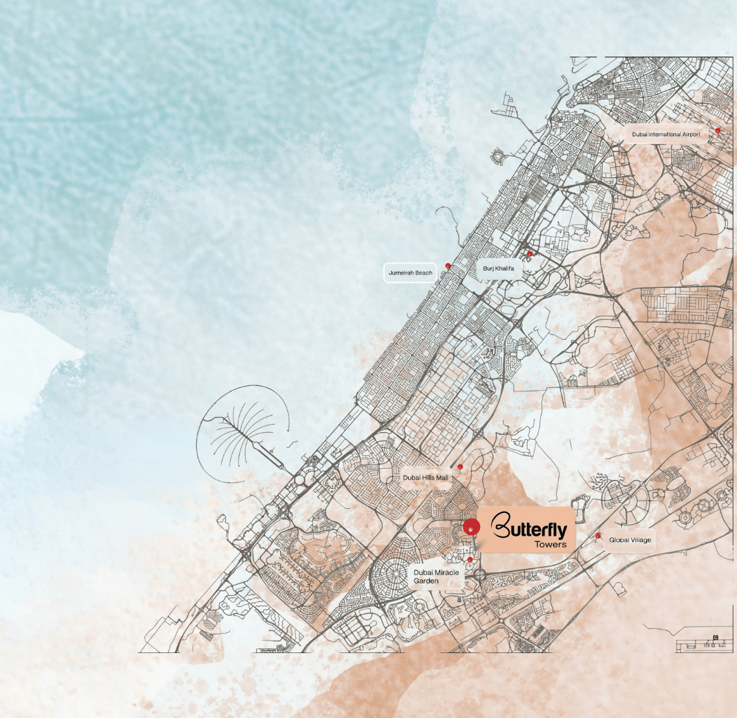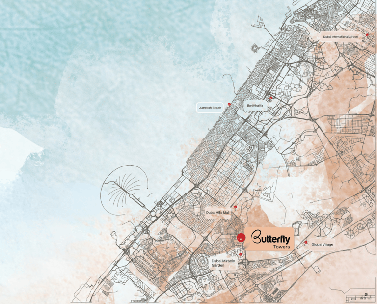 Located in Arjan, Butterfly Towers provides excellent connectivity to key destinations across Dubai via Sheikh Mohammed Bin Zayed Road (E311) and Umm Suqeim Street (D63).